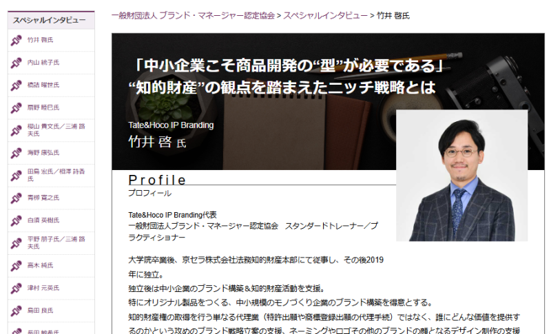 一般財団法人ブランド・マネージャー認定協会(https://www.brand-mgr.org/)の「スペシャルインタビュー」にて、弊所代表・弁理士 竹井啓のインタビュー記事「『中小企業こそ商品開発の“型”が必要である』 “知的財産”の観点を踏まえたニッチ戦略とは」が掲載されました。